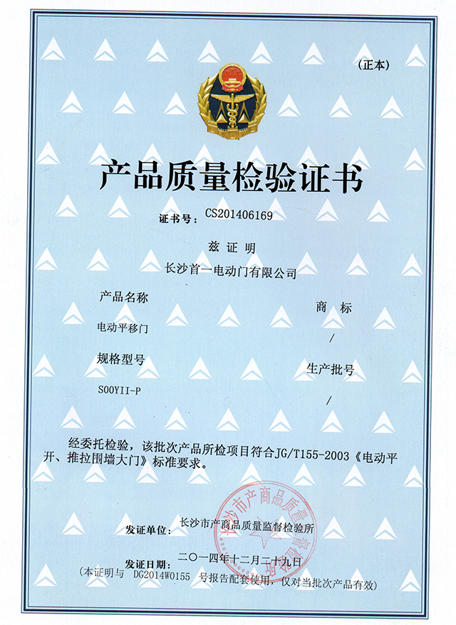 平移門質(zhì)量檢驗證書