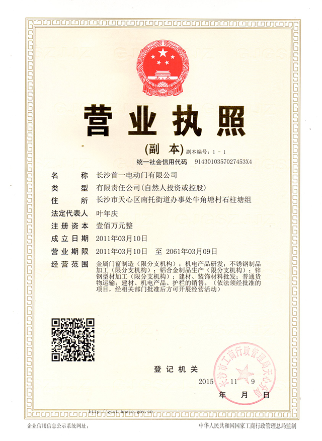 長沙首一電動門有限公司(營業執照代碼:9143010357027453X4)
